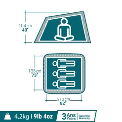 Our team of enthusiasts imagined this pre-assembled tent for 3 people seeking low weight and habitability (2 side porches).A simple and practical, lightweight and compact tent that offers good habitability for 3 people. 2 doors. 2 porches (storage areas). Camp comfortably in 3 seasons mode.
