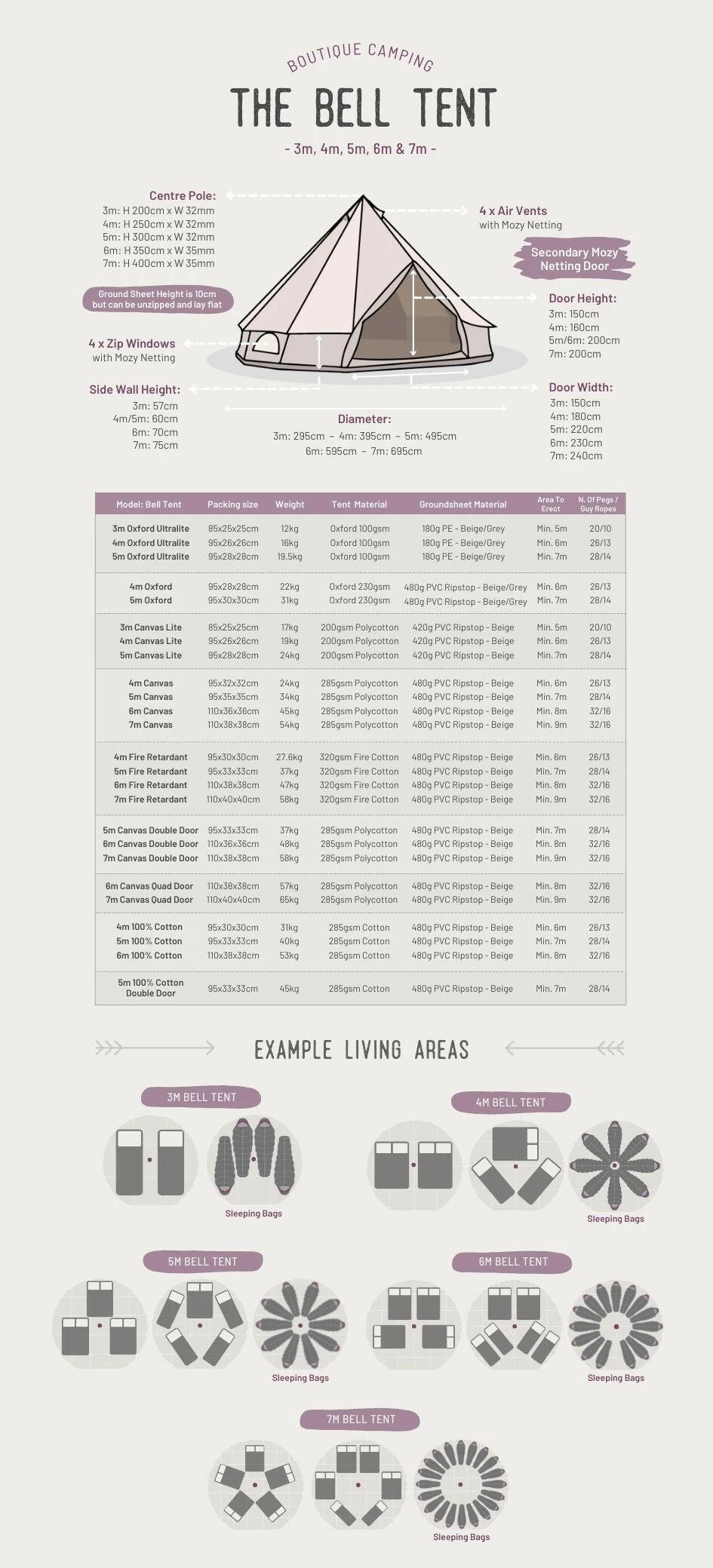 I embody the same traditional and iconic practicalities as the Bell Tent design, with the uncompromisable option to either DOUBLE up on glamping-glory, or really go FOUR it with my quad door option. With every additional door seamlessly integrated into breathable polycotton (285gsm) skin, my natural light, air flow, and head space increase simultaneously…