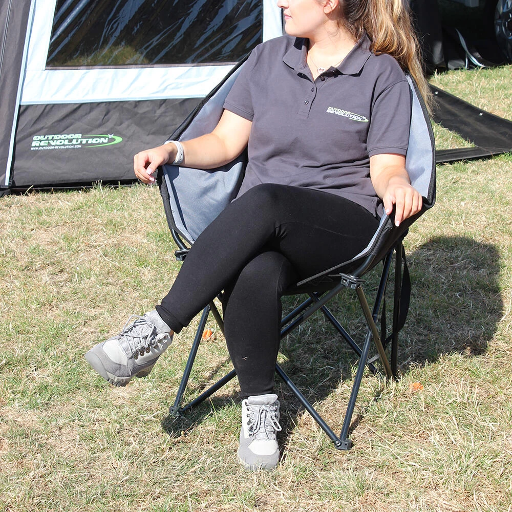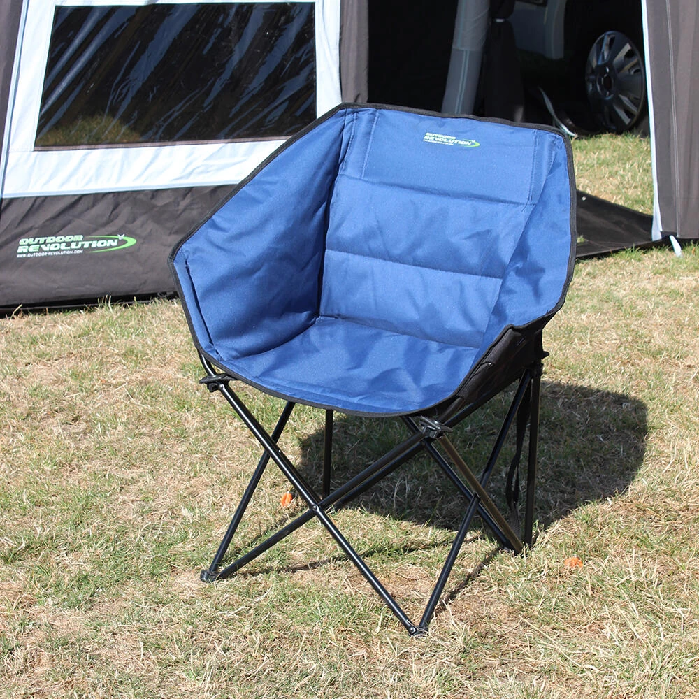A compact folding camp chair with comfortable padded surround sides and supportive backrest. The padded fabric and sturdy steel frame provide exceptional comfort and support whilst the oversize wide base feet help to prevent the chair from sinking into soft ground and damaging ground sheets. Available in a choice of 3 complimenting colour variations. • Opens and folds in seconds