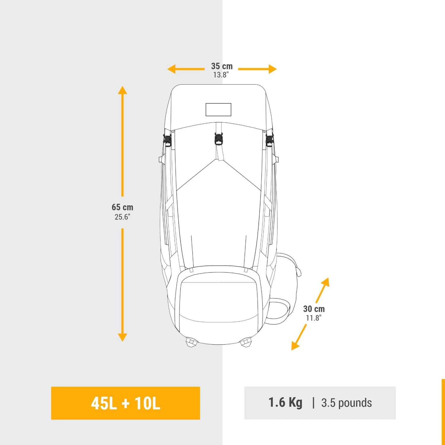 The bag has a 45 L volume with an extension for carrying an additional 10 L. The volume of each backpack is measured using a standardised method. we use small balls to fill the main compartment as well as each pocket. The balls are then emptied into a graduated container in order to determine the equivalent volume in litres, with a margin of error of just a few %.